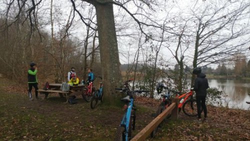 Pendant la petite pause du matin au bord de l’étang de Saint-Viâtre. Les marcassins à vtt ont parcouru 25 km sur les chemins solognots et découvert le chafaud, à Saint-Viâtre, construction qui les a beaucoup intriguée.