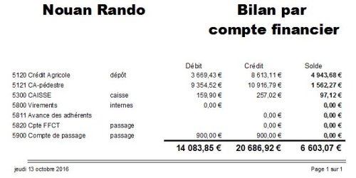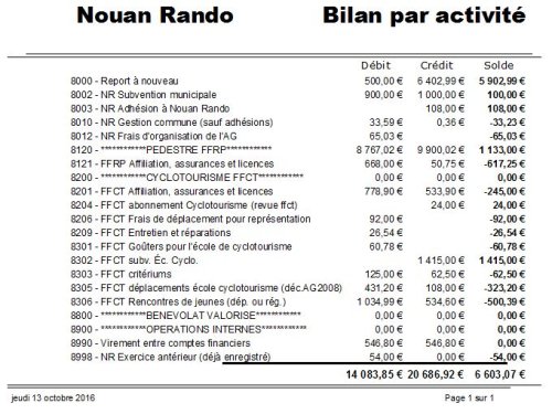 Ce bilan constitue aussi le compte de résultats. La comptabilité est normalisée et utilise la nomenclature européenne pour les associations, nomenclature qui n’est guère parlante pour la plupart des adhérents. Dans un souci de transparence, Nouan-Rando préfère donc publier ce bilan par activités.