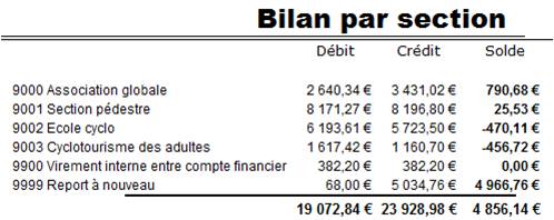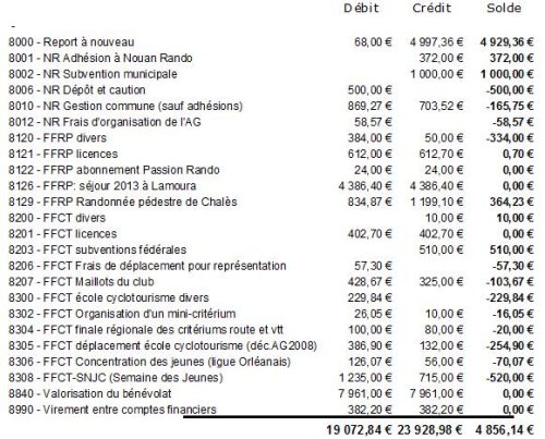Suite à une question d’un participant à l’AG , il est précisé que le compte "Ecole Cyclo" est en déficit en raison de la décision de l’AG2012 de prendre en charge la moitié du coût de la participation des jeunes de Nouan-Rando à la SNEJ (Semaine Nationale et Européenne des jeunes). Quant au compte "Cyclotourisme des adultes, son déficit s’explique par l’affectation des 20% pris en charge par le club sur l’achat par les licenciés du maillot du club.