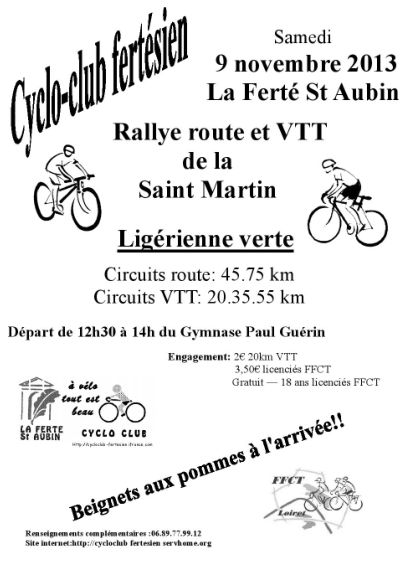 | 9 novembre | Ligérienne verte (vtt ) et randonnée route | La Ferté-Saint-Aubin (45) |