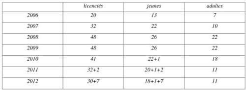 11 adultes licenciés en 2012. Seuls 3 d’entre eux ne sont pas parents de jeunes de l’école mais ils sont très actifs dans l’encadrement. De ce fait, l’activité cyclo adulte pure est plus individuelle.