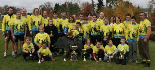 Le sanglier autour duquel tout le monde s’est installé est une statue qui décore le parc Cauchoix à Nouan-le-Fuzelier. C’est un animal emblématique de la Sologne. Les jeunes de l’école cyclo en ont fait leur mascotte et ont souhaité qu’il figure sur le maillot du club. C’est pour cela qu’un beau sanglier bleu faisant du vtt illustre le dos de tous les adhérents de Nouan Rando.