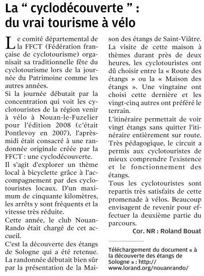 Comme les années passées, la fête du cyclotourisme était organisée pour la journée du patrimoine. Cette année, c’était Nouan Rando qui était chargé d’accueillir la concentration départementale et de mettre en place une cyclodécouverte. Comme thème, Nouan Rando avait choisi "à la découverte des étangs solognots).