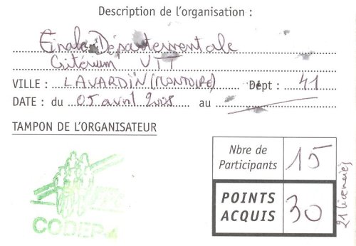 | Finale départementale du critérium Vtt | Lavardin | 5 avril | 15 | 30 | |